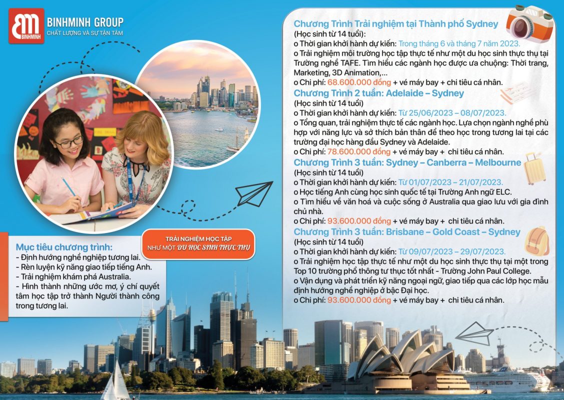 Với xu thế đó chương trình “Trại hè hướng nghiệp tại Sydney, Australia – khởi đầu hành trang du học” do Bình Minh tổ chức Kết hợp với Trường Giáo dục Nâng cao và Kỹ thuật New South Wales (TAFE NSW) và SET Education sẽ đưa các bạn học sinh sẽ cơ hội khám phá đất nước Australia xinh đẹp và hiện đại, bên cạnh đó các bạn còn được trải nghiệm môi trường học tập thực tế như một du học sinh thực thụ.